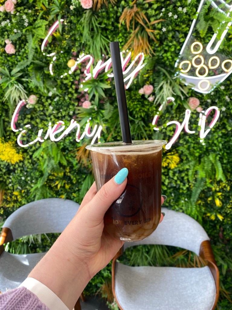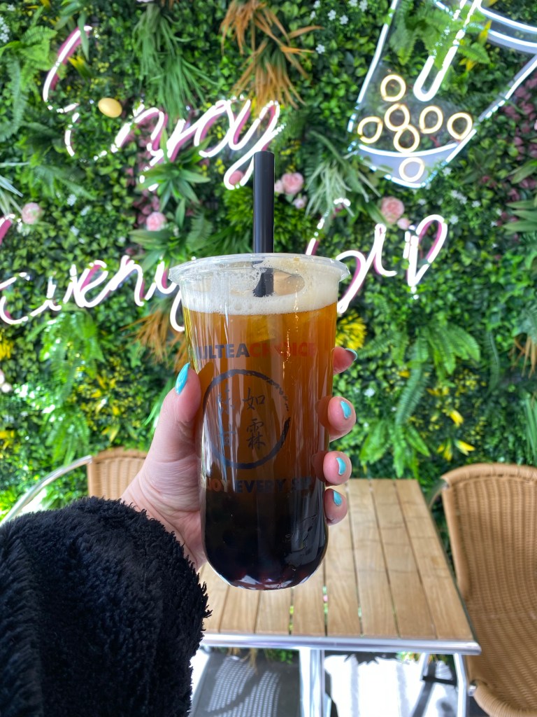Perfect sweetness (I can’t remember what percentage I went for so this could vary) no tannins either which was nice given this is a tea! The flavours were subtle, sightly fruity with a toasty/nutty aftertaste. The crystal pearls were really interesting: they weren’t super flavourful but had a really cool texture, similar to tapioca but with more of a crunch – I’d definitely recommend if you’re a tapioca pearl fan but want to try something different!