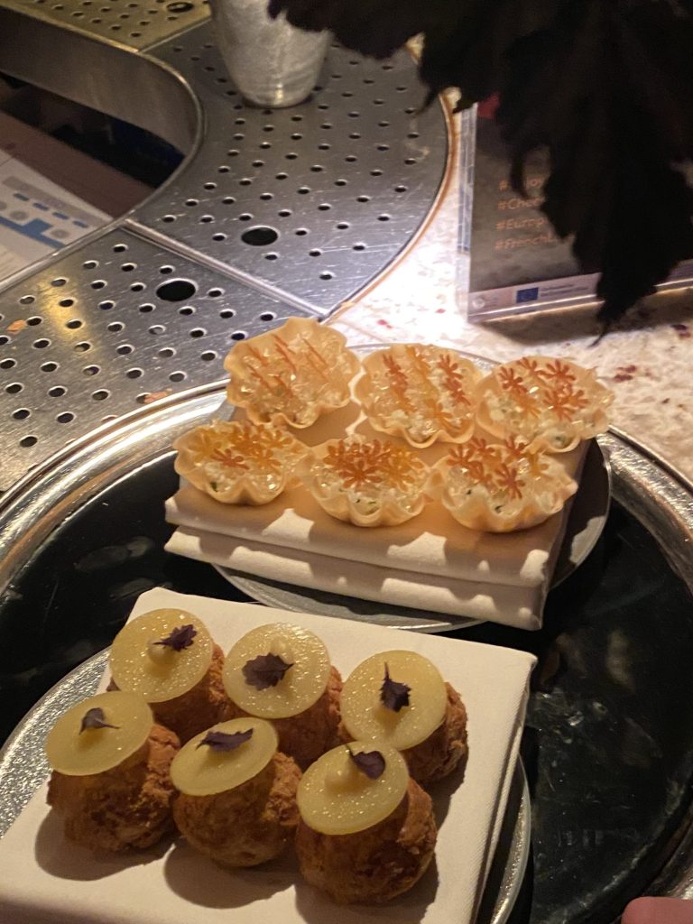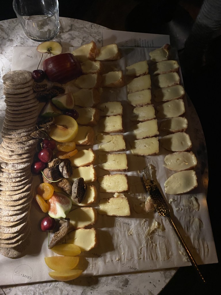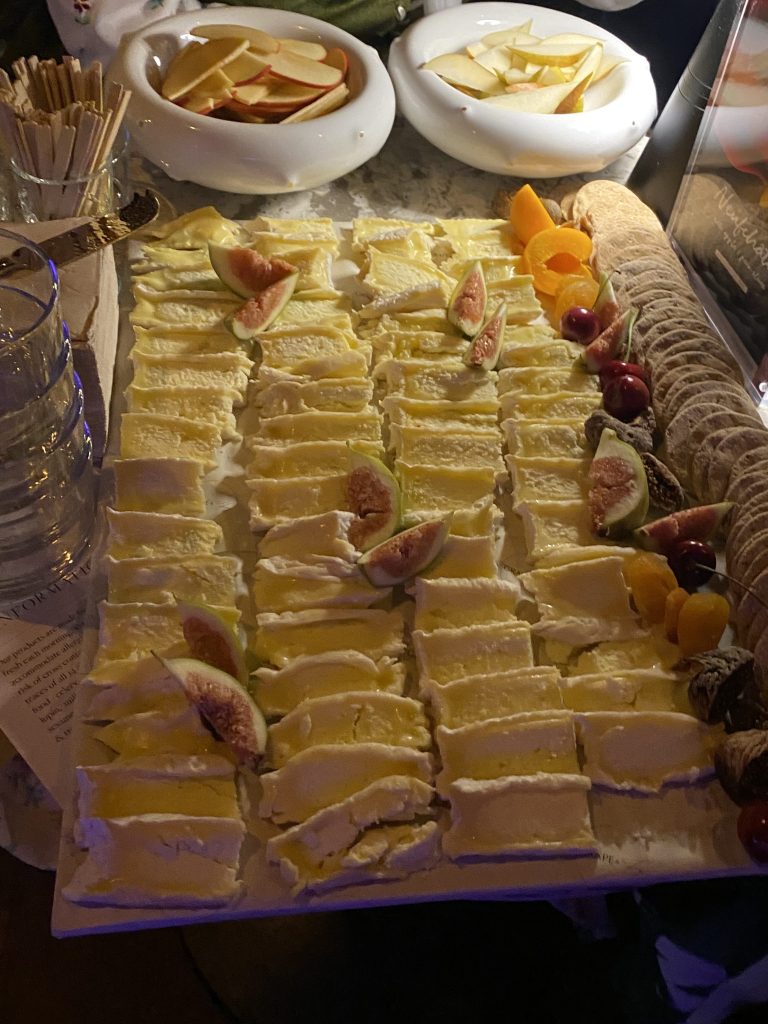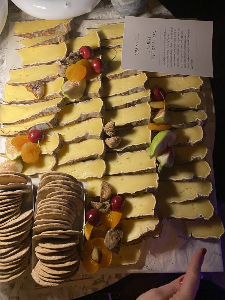 Despite having spent time with all the cheeses, the evening was far from over. The two of us floated from place to place – ensuring we were topped up with wine, grazing on a beautiful cheese and garnish board hidden away at the back of the room – and eventually ending up back at Époisses’ table. This is where things became, to quote Alice ‘a fever dream’. One of the cheeses gave us their Michael Caine impression – not a sentence I ever thought I would write – and when Beaufort saw me talking to Époisses, the two of them started fighting over me: again, a sentence I never thought I would say. Alice and I were enthralled, giggling away as two very obviously not French men argued about whether I wanted to be with Époisses or Beaufort more (I reassured Beaufort that I picked him – and indeed when choosing a favourite cheese at the end of the event, I wrote Beaufort’s name down).
