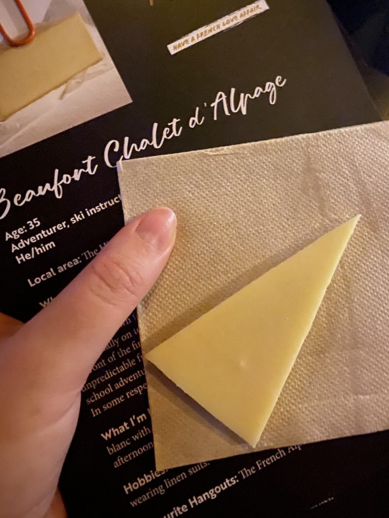Emma gave us some introductory facts about French cheese in general, before letting us know that we would have four minutes with a ‘cheese’ (at this point it was made apparent that the ‘cheeses’ were the actors: effectively they personified the cheese) to get to know them more, find out about the cheese, and, of course, sample some. We were handed the dating profiles of the cheeses we were going to talk to that evening – including tidbits such as Brillat Savarin being a 30 year-old food critic for the Telegraph, a ‘bit of a dandy’ who loves ‘secretly trolling my rivals on social media’, or Bleu d’Auvergne being an eccentric but kind inventor – and the curiosity and bemusement heightened. Suddenly, a bell rang, and the speed-dating began. Alice and I quickly sat ourselves with the nearest cheese, a Little-Bo-Peep-esque woman with bright red lips and a blonde wig, speaking in a French accent (which, as someone fluent in French, was honestly not believable, but I wasn’t about to spend the evening complaining about this…).