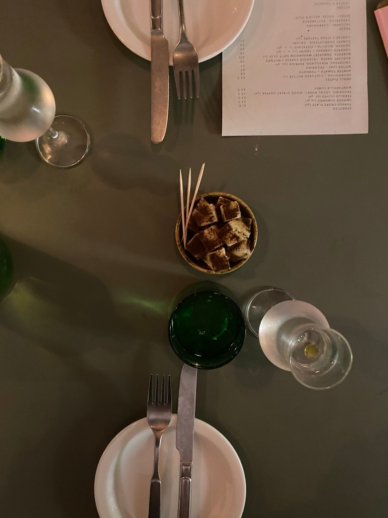 At the end of this delicious meal came the all-important question: dessert. I decided on the fly that we would be ordering and sharing one – we opted for the tiramisu and oh my god was this the right choice. It wasn’t a large portion, so between the two of us came to a few bites each, but that was all that was needed: the decadent, slightly liquid cream sat atop some orange-flavoured sponge fingers – texture-wise resembling semolina – and whilst I would class this tiramisu as ‘strong’ it wasn’t overpoweringly boozy. I have always been a sucker for tiramisu and I can easily say this was up there in my top three tiramisus I’ve eaten.
