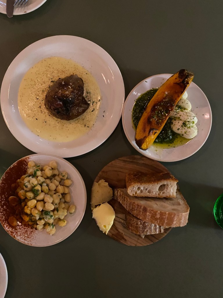 The chickpeas and sourdough came out first, we were presented with an array of breads (focaccia, a white sourdough and a brown sourdough) and two types of homemade butter: cultured butter (butter with added kefir ferment) and burnt butter (the most heavenly thing I have ever tasted, I cannot even describe this other than by asking you to try it yourself). This was a great start – though unfortunately the first bit of bread I tried was the focaccia and for some reason it was incredibly tough and hard to bite through – but the rest of the breads (and the butters!!) were delicious. The chickpea salad was also really tasty – the tiny capers and smoked paprika it was covered in made it – but the small plates which stood out were undoubtedly the squash and the onion. Both of these dishes had the similarity of having a slightly sweet, caramelised element (roasted squash or onion) and a creamy, cheesy, delicious sauce to dip them in. The squash melted in your mouth, the taleggio was like dipping a caramelised onion in a fondue: I genuinely cannot decide which of the two I preferred.