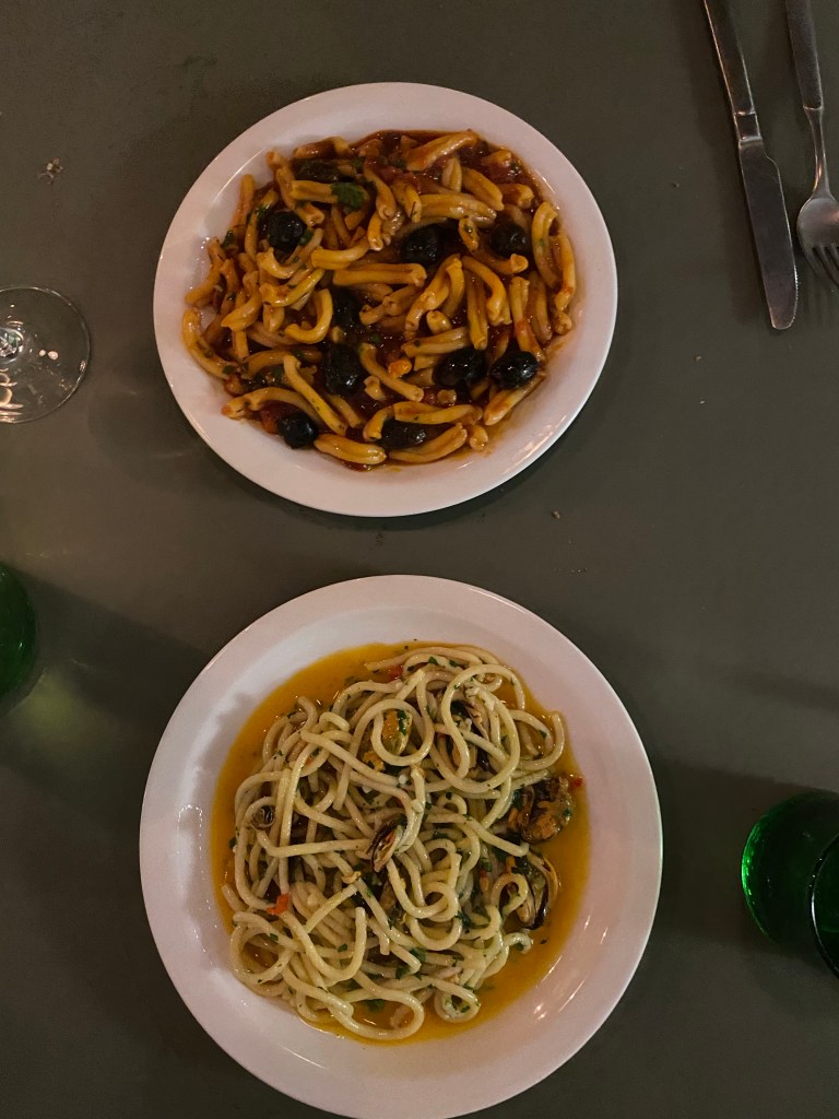 The last of the melted cheese and butters mopped up by the bread, our empty plates were whisked away and replaced soon after by the pasta dishes we had chosen: a vegetarian Puttanesca for Sophie and a Mussel Aglio e Olio for me. The portion sizes were decent – appearing far larger than they should have after the banquet of a starter – and the pasta was clearly freshly made. Both sauces we had chosen were delicious, if on the salty side, the pasta on my plate dripping in garlicky, chilli-y oil with an occasional burst of fishiness from the mussels. Sophie’s was a smooth tomato sauce with olives and capers – so well cooked it was almost caramelised and my attempt to steal an olive from her plate was thwarted as it disintegrated under my fork.